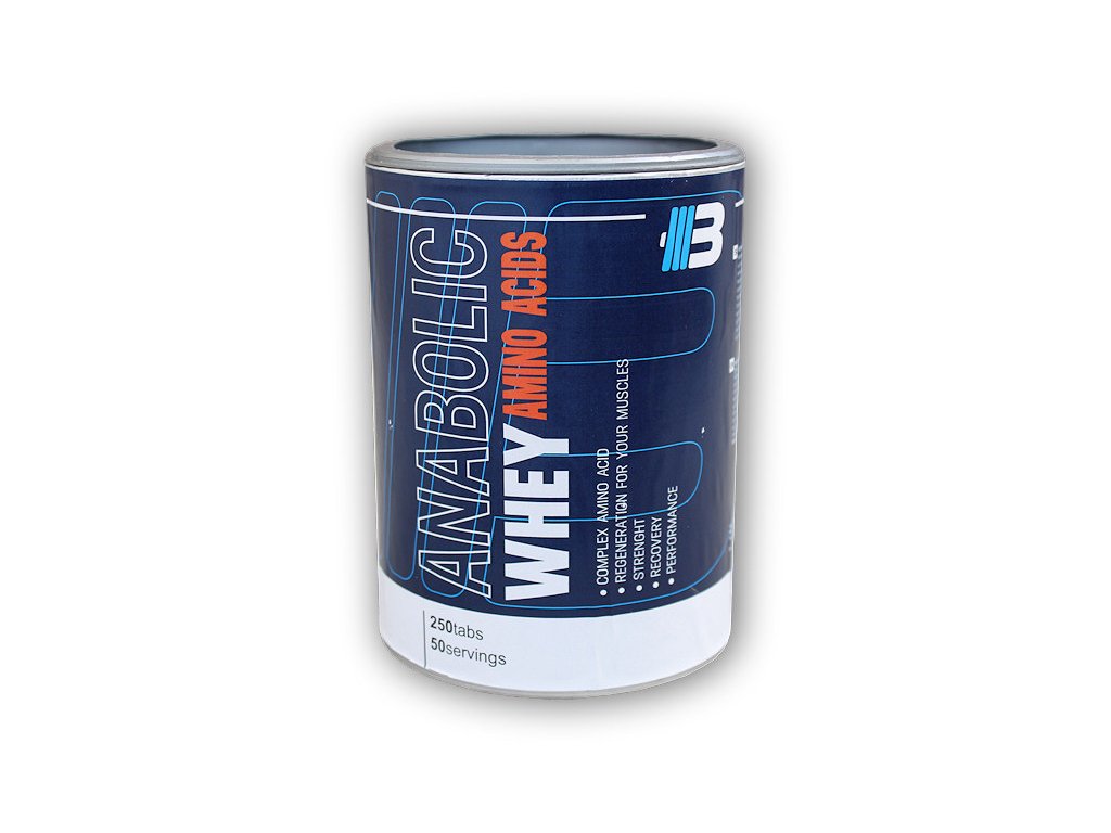 Whey anabolic amino acids jsou 100% čisté vysoce kvalitní syrovátkové aminokyseliny ve formě tablet. Jedná se o komplexní aminokyseliny a patří mezi nejkvalitnější a nejoblíbenější aminokyseliny dostupné na trhu. Tyto aminokyseliny jsou vyrobeny výlučně z mléka a proto neobsahují lepek a lepek. Whey anabolic amino acids obsahují komplexní aminokyselinové spektrum s vysokým podílem esenciálních BCAA a neesenciálních aminokyselin. Vynikající se vstřebávají a proto fantasticky urychlují regeneraci, zvyšují sílu, růst čisté svalové hmoty a jsou skvělý doplněk pro sportovce usilující o zvýšení a podporu výkonu. Podporují nárůst čisté svalové hmoty a její ochranu před rozpadem i během diety a při extrémním zatížení organizmu během tréninku. Skvělý doplněk i při vytrvalostních sportech, kdy se tablety užívají během zátěže a zapíjejí se vodou nebo iontovým nápojem Iso power energy od Body Nutrition. Oddalují únavu a zlepšují silový výkon během zátěže.