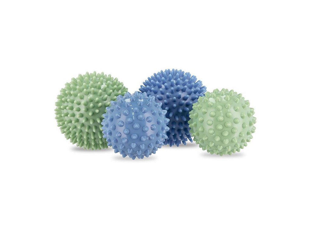 Sada 4 masážních míčku s výstupky - 2 velikosti (6,5 cm a 9 cm) a 2 tvrdosti (černá - tvrdá, modrá - měkká):