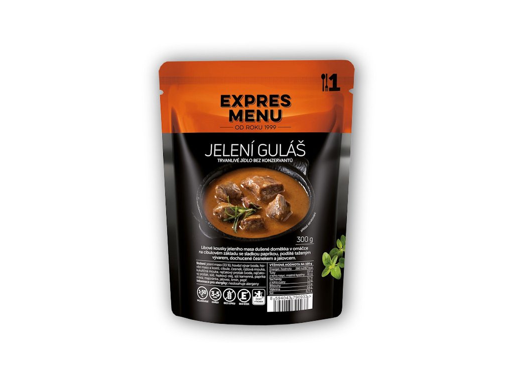 obsahuje: jelení maso (33 %), hovězí vývar (voda, hovězí maso a kosti), cibule, řepkový olej, rýžová mouka, kukuřičná mouka, rajčatový protlak (voda, rajčatový protlak, sůl), sůl kamenná, paprika, pepř, česnek, majoránka, jalovec.