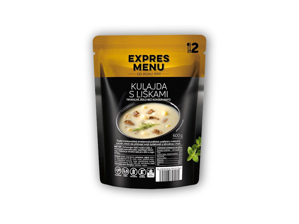 obsahuje: voda, brambory, smetana, vejce, houby lišky obecné (3 %), cukr, ocet, rýžová mouka, kukuřičná mouka, kopr sterilovaný (voda, kopr, ocet kvasný, cukr, sůl), sůl kamenná, pepř.
