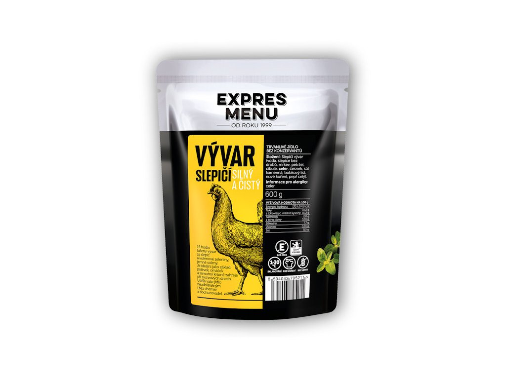 obsahuje: Slepičí vývar (voda, slepice bez drobů, mrkev, petržel, cibule, celer, česnek, sůl kamenná, bobkový list, nové koření, pepř celý).