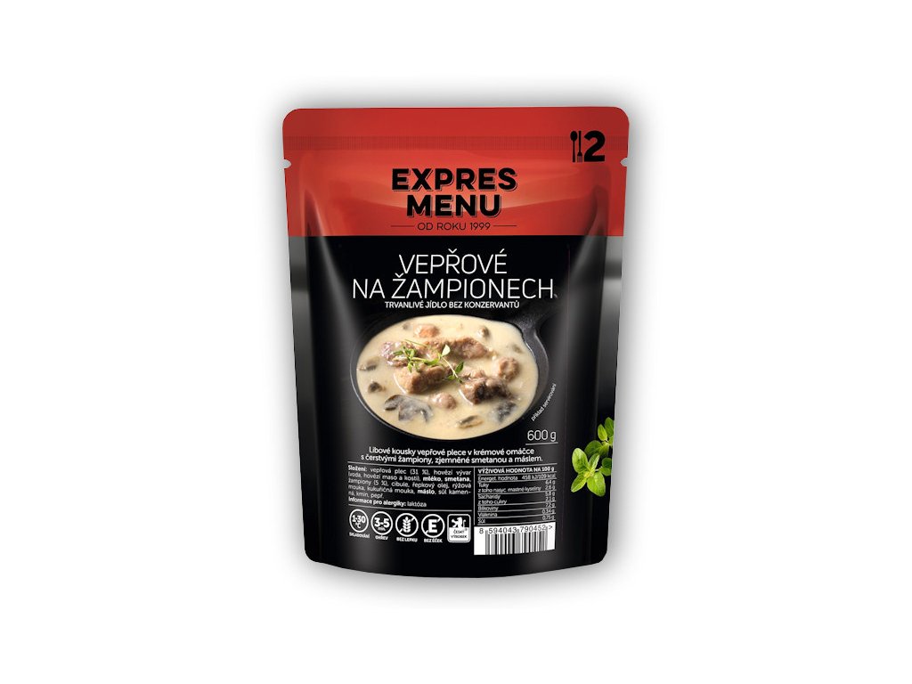 Libové kousky vepřové plece v krémové omáčce s čerstvými žampiony, zjemněné smetanou a máslem.