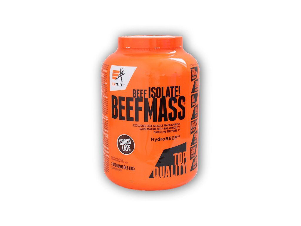 Všichni kulturisté preferují sílu hovězího masa už od dob Arnolda Schwarzeneggera. Právě vývar z hovězího masa tvoří proteinový základ gaineru BeefMass. Hovězí maso (izolát s obsahem 99 % hovězích bílkovin) jsme doplnili kvalitním matrixem sacharidů pro maximální nárůst síly a svalové hmoty. BeefMass je nový gainer, který obsahuje izolovanou hovězí bílkovinu (která je několikanásobně koncentrovanější než hovězí maso - zcela bez cukru a s absolutním minimem tuku). Izolát z hovězího masa je jeden z nejkvalitnějších bílkovinných zdrojů, jehož užívání má v silových sportech dlouhou tradici. BeefMass je určen pro všechny, kdo usilují o nárůst svalové hmoty a síly.