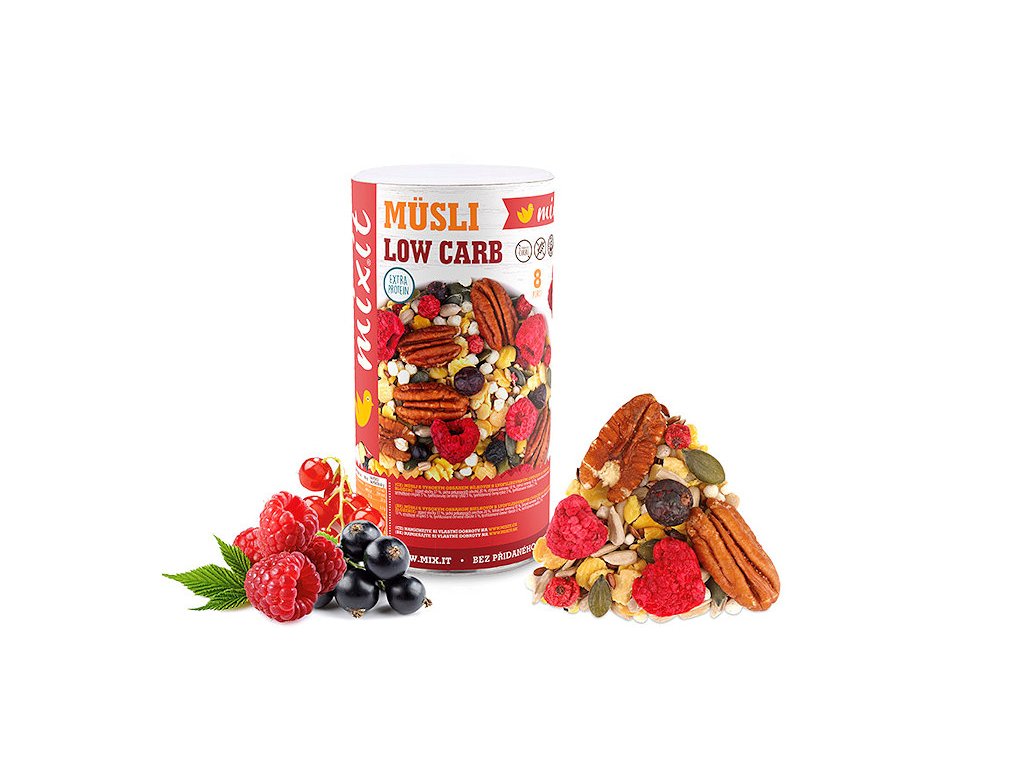 První low carb müsli od Mixit. Obsahuje jen 10 % sacharidů! Hledali jste mix müsli s minimem sacharidů a cukrů a zároveň s vydatnou porcí bílkovin a vlákniny? Je tady první \"low carb\" müsli, které nabídne chuťový koncert mrazem sušeného ovoce s křupinkami bohatými na proteiny, pekanových oříšků a 3 druhů semínek. Mix obsahuje pouze 10 % sacharidů a z toho jen 5,1 % cukrů z černého a červeného rybízu s malinami. 28 % bílkovin v kombinaci rostlinné a syrovátkové složky uspokojí nejen náročné sportovce. Nabijte se low carb energií od Mixit.