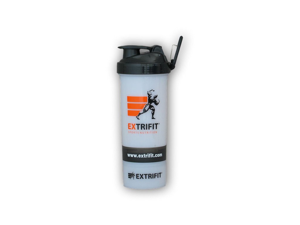 Praktický lesklý a transparentní šejkr Extrifit se zásobníky na tablety či sypké formy suplementů. Hlavní nádoba a větší zásobník jsou mléčné transparentní, uzávěr a menší zásobník jsou černé. Uzávěr je šroubovací, malé víčko zaklapávací. Plastová karabina na pověšení šejkru. Po jedné straně samotného šejkru jsou v průhledu rysky v ml/oz pro odměření objemu tekutiny (do 600 ml), šejkr samozřejmě obsahuje mřížku pro lepší rozmíchání nápoje. Vpředu a vzadu je na nádobě umístěno oranžovo-černé logo firmy Extrifit, na menším zásobníku webová adresa a na větším pak logo v černém provedení.