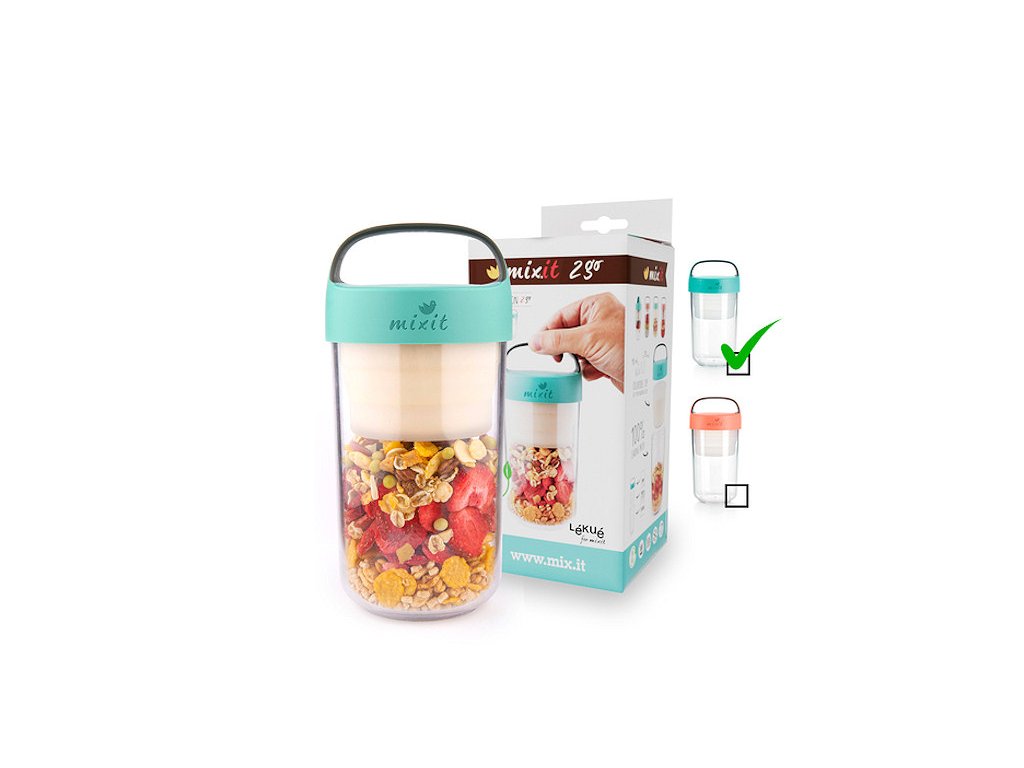 Novinka! Vezměte si svůj Mixit kamkoliv! Svačinový box Mixit 2go v krásné mentolové barvě je skvělý parťák do práce, do školy nebo na výlet. Do horní mističky si můžete dát jogurt, mléko, vodu nebo třeba čerstvé ovoce. Do spodní si nasypte svůj oblíbený mix, kaši, lyo ovoce nebo oříšky, zkrátka cokoliv máte rádi. A v mžiku jste připraveni na mlsáníi!