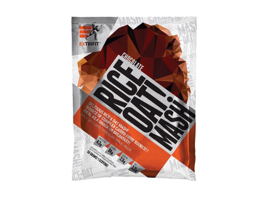 Prémiová rýžová kaše Extrifit ®. Žádné vaření, vše za studena. Příprava trvá 1 minutu! 1 dávka = 1 sáček. Excelentní chuť! Rice & Oat Mash je hotová směs vynikající rýže ve formě snadno rozpustných rýžových vloček s ovocem, kokosem a čokoládou. Delikátní chuť jednotlivých příchutí je dána pouze přírodními ingrediencemi. Základem produktu je 100% rýže ve formě snadno rozpustných rýžových vloček, která tvoří 80 % zdrojů komplexních sacharidů výrobku Rice & Oat Mash. Dalších 15 % komplexních sacharidů produktu tvoří ovesné vločky a 5 % pšeničné vločky.