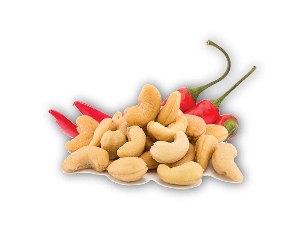 obsahuje: 97,3 % Kešu pražené/, 1,6 % sůl/soľ, 0,6 % aroma Chilli/aróma Chilli, 0,5 % bramborový škrob/zemiakový škrob