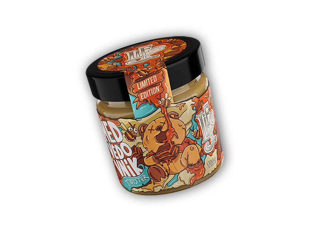Twister Medvědovník je poctivá směs mandlí a vlašských ořechů doplněná karamelovou čokoládou, medem a špetkou perníkového koření. Výsledek? Krém, který voní po karamelu, skořici a hřejivém pohodlí – jako když si dáš první sousto dezertu, který znáš od dětství.