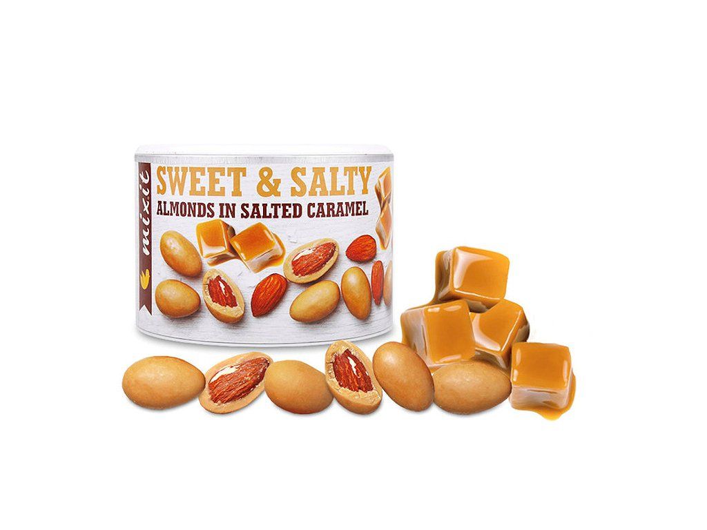 obsahuje: pražené mandle v bílé čokoládě se slaným karamelem (bílá čokoláda s karamelem 71 % (cukr, kakaové máslo, sušené mléko, karamelový prášek s mléčným tukem (sušené mléko, sušená syrovátka, cukr, mléčný tuk, přírodní vanilkové aroma), karamelizovaný cukr 1.5 %, kakaová hmota, emulgátor: lecitiny a sójový lecitin; sůl), jádra mandlí pražená 27 %, leštící látka: arabská guma; cukr, med, jedlá sůl 0,3 %).