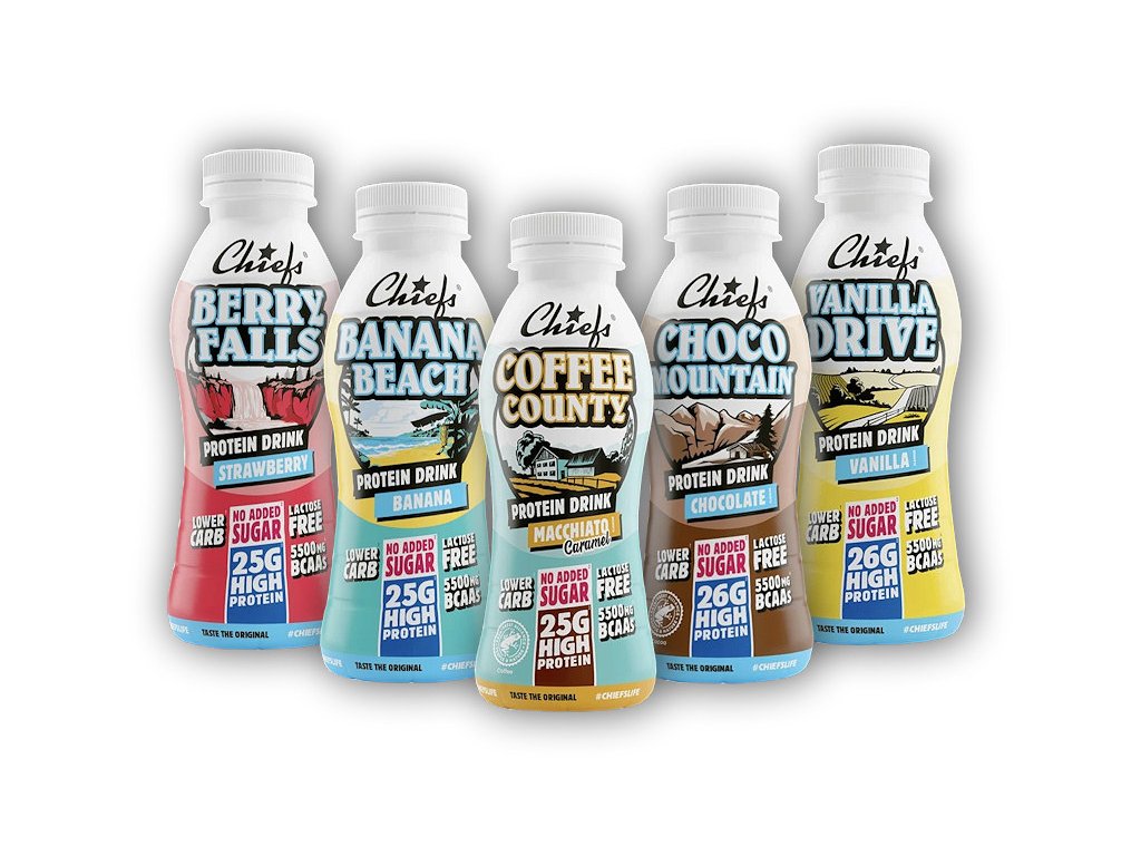 CHIEFS Proteinový nápoj je lahodný vysoce proteinový mléčný nápoj s příchutí. V praktickém jednorázovém balení, díky kterému ho můžete konzumovat ihned. Oblíbíte si ho jako proteinový snack v posilovně, protože obsahuje BCAA a také v práci i na cestách. Jedno balení obsahuje až 26 g bílkovin, které přispívají k růstu a udržení svalové hmoty a k udržení zdravých kostí. Je bez laktózy a bez přidaného cukru.