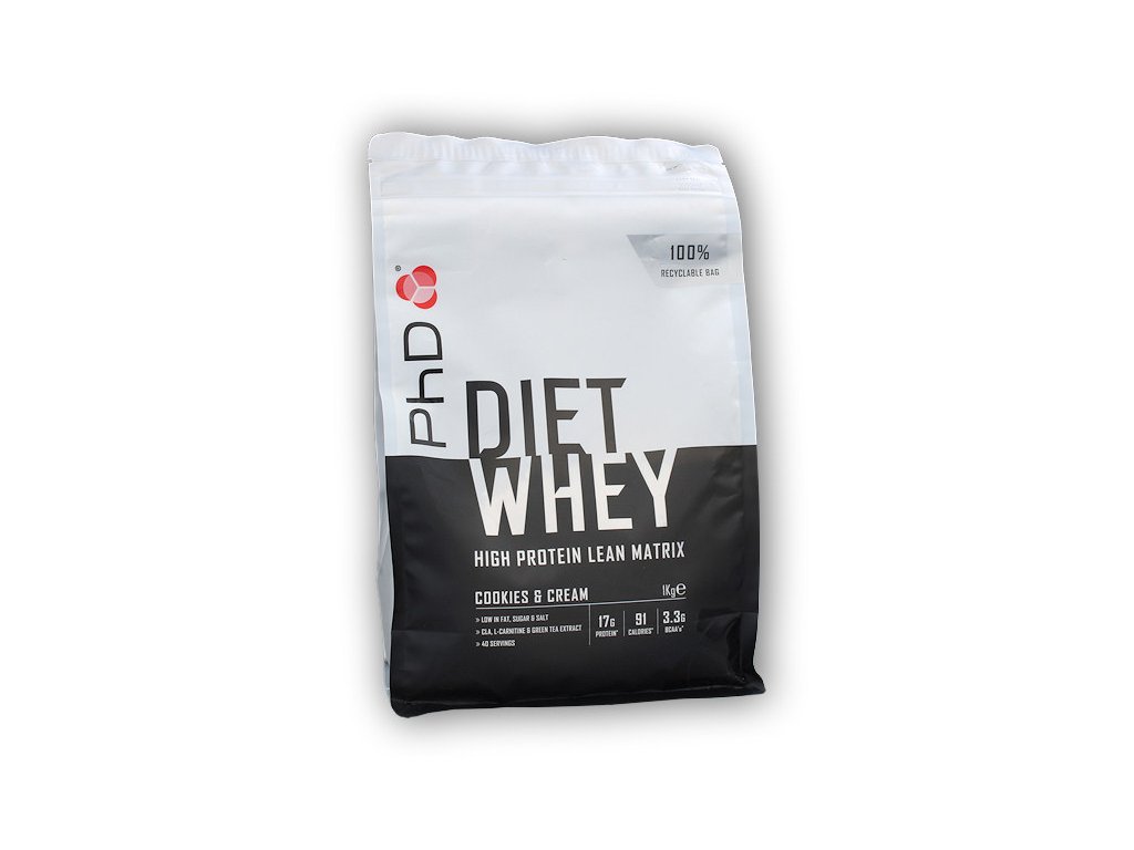 Diet Whey obsahuje: PhD Lean Body Slow Release Protein Blend (syrovátkový koncentrát (27 %), koncentrát mléčné bílkoviny, sójový izolát), kakaový prášek (jen příchuť belgická čokoláda, čokoláda/pomeranč), Enduragrain (škrob z ječmene s dlouhou délkou řetězce), moučka z lněných semínek, dietní vláknina (guma z akácie, guarová guma, xantanová guma), přírodně identické a umělé aroma, CLA moučka (obsahuje mléčnou bílkovinu, lecitin, vitamín E), acetyl-L-karnitin, přírodní barvivo: červená řepa (jen příchuť jahoda),extrakt ze zeleného čaje, chlorid sodný, sladidlo: sukralóza