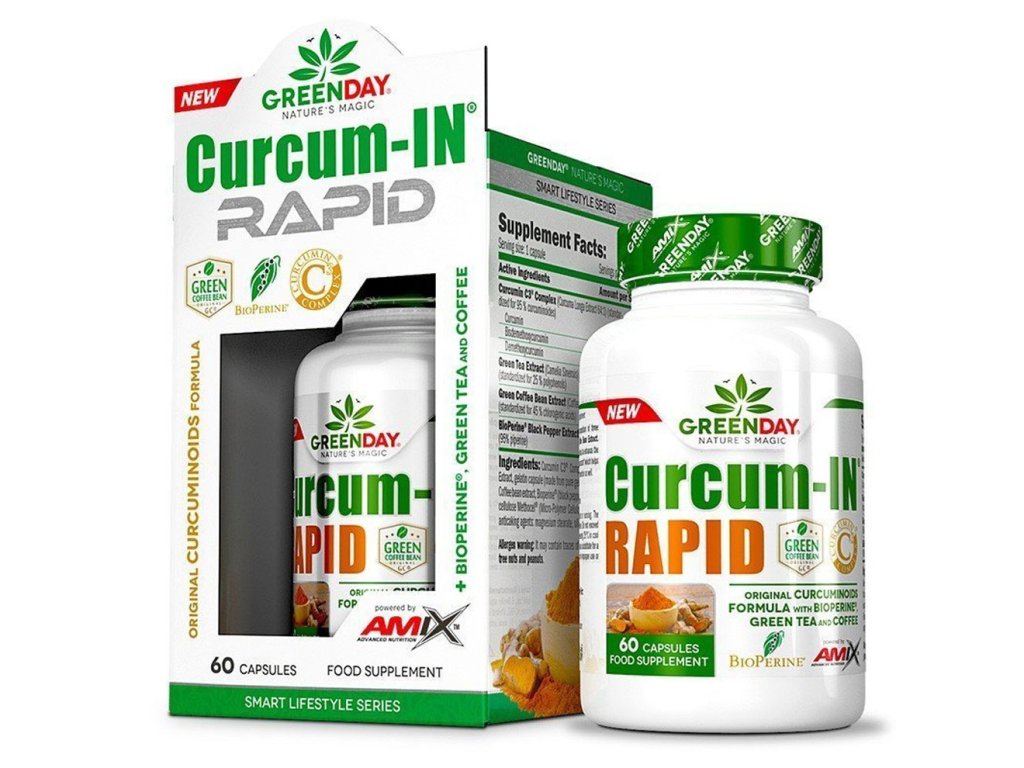Green Day® Curcum-IN® Rapid obsahuje patentovanou směs tří kurkuminoidů, obohacenou o extrakt ze zeleného čaje a zelených kávových zrn. Obsažený extrakt z černého pepře BioPerine® zajišťuje normální trávení a pomáhá zlepšit biologickou dostupnost kurkuminu. Vše dohromady se stává výborným přírodním antioxidantem, který zabraňuje tvorbě volných radikálů.