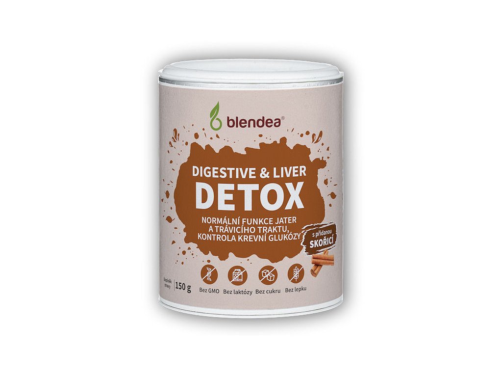 Blendea Digestive & Liver Detox je funkční směs rostlinných surovin. Obsahuje složky jako čekanka, drcený ostropestřec, vláknina psyllium z jitrocele, cejlonská skořice a ajurvédská ovocná směs Triphala.