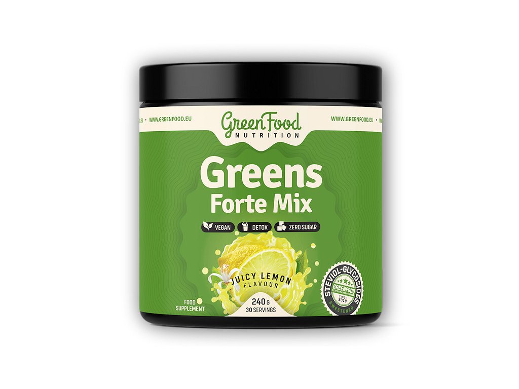 Greens Forte Mix je funkční směs zelených superpotravin, adaptogenů z rostlinných zdrojů v podobě asijských hub používaných v tradiční čínské a japonské medicíně. Obsahuje důležité vitamíny a minerály z přírodních zdrojů podílející se na antioxidačních procesech v lidském těle, aminokyseliny fungující jako startér mnoha neutralizačních pochodů v našem organismu a neposlední řadě i vysokou dávku citrusových bioflavonoidů doporučovaných k udržení buněčného zdraví neutralizací volných radikálů.