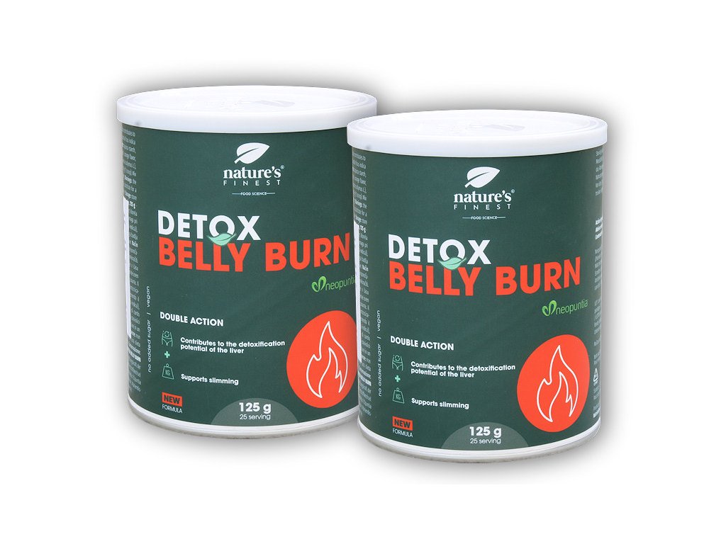 Detox Belly Burn je určený pro podporu spalování nadbytečného tuku v oblasti břicha. Obsahuje patentovanou směs NeopuntiaTM, která dodává pocit sytosti a podporuje vylučování nestrávených cukrů a tuků. Obsažený ostropestřec a chlorella mají antioxidační účinky související s činností jater i zažívacího systému, zatímco artyčok stimuluje trávení. Detox Belly Burn je slazený pouze steviol-glykosidy a má lehkou citrusovou příchuť.