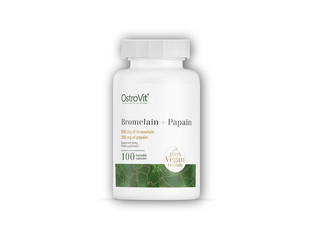 obsahuje: Bromelain 2500 GDU, papain 6000 USP, obal kapsle (plnidlo: hydroxypropylmethylcelulóza), protispékavá látka: hořečnaté soli mastných kyselin.