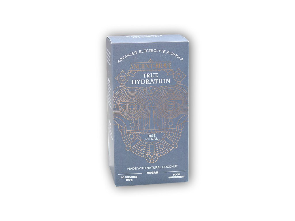 žitou roli ve fungování kostí a svalů, je potřebný pro syntézu DNA a RNA - stavebních kamenů života. Mnoho studií ale ukazuje, že většina populace nemá dostatečný příjem hořčíku. Citrát hořečnatý obsažený v True Hydration je získaný z přírodního minerálního zdroje mořského původu. Jde o vysoce rozpustný, snadno absorbovatelný a bioaktivní zdroj hořčíku. Citrát draselný - Draslík je pro tělo klíčový minerál hrající hlavní roli v mnoha tělesných oblastech, od udržení rovnováhy tekutin v buňce, přes krevní tlak, fungování nervů, detoxikaci, až po glykogenové zásoby ve svalech. Citrát draselný v True Hydration byl vybrán pro jeho čistotu a vysokou biodostupnost. Jablečnan vápenatý - vápník je ze všech minerálů v těle nejhojnější, téměř 99 % tělesného kalcia je uskladněno v kostech a zubech. Tento esenciální minerál je ale potřebný pro mnoho jiných míst než jen pro kosti. Jde o klíčový elektrolyt pro optimální hydrataci, komunikaci nervů, krvetvorbu, tvorbu hormonů a fungování svalů. Mnoho z nás ho ale nekonzumuje dostatečně. Jablečnan vápenatý je organická, vysoce biodostupná forma vápníku. Pikolinát chromitý - méně známý stopový minerál, ale velice důležitý. Jeho vlastnosti souvisí s kontrolou krevního cukru, metabolismem živin, stabilitou energetické hladiny, srdcem, kontrolou hmotnosti a mozkem. Pikolinát chromitý je organická forma chromu ve vazbě s kyselinou pikolinovou, jde o snadno a efektivně vstřebatelnou formu. Prášek z kokosové vody - osvěžující vosa z kokosů je po staletí užívaná v tropických zemích jako pomoc pro celou řadu problémů. V Sánskrtu jsou kokosovníky nazývané \"stromy, které dávají vše, co je nutné pro žití\". Kokosová voda je nejlepším známým přírodním zdrojem elektrolytů, delikátní kokosová voda v true Hydration byla vybrána experty pro zajištění co nejvyšší čistoty. Inulin z kořene čekanky - rozpustná vláknina je významný zdroj potravy pro přátelské kultury tvořící střevní mikrobiom. Organický inulin v produktech Ancient Brave pochází z kořene čekanky a má lehkou, sladkou chuť, která pomáhá uspokojit odpolední bažení po sladkém. Jako zdroj vlákniny také pomáhá prodloužit pocit plnosti a podporuje chod zažívacího traktu. Správné trávení je základem celého metabolismu. Růžová Himalájská sůl - ochráněná od znečištění sněhem a ledem je Himalájská sůl zachovaná v nedotčeném prostředí a je považovaná za nejčistší sůl na světě. Zatímco obyčejná sůl poskytuje chlorid sodný, Himalájská sůl obsahuje plné spektrum minerálů (vápník, sodík, hořčík, draslík) a obdivuhodných 84 stopových minerálů a prvků. Minerály jsou v soli obsažené v koloidní formě, což znamená, že jsou dost malé na to, aby byly rychle a snadno absorbovány. V ČEM JE ROZDÍL? + Prémiová kvalita + Celkem 8 bioaktivních složek: kokosová voda v prášku (53 %), inulin z kořene čekanky, citrát hořečnatý, citrát sodný, jablečnan vápenatý, růžová himalájská sůl, citrát draselný, pikolinát chromitý. + Etická a šetrná produkce (udržitelné – ekologické zemědělství) + 100% přírodní složení + Akreditovaná kvalita: Soil Association + GMO free + Gluten free (bez