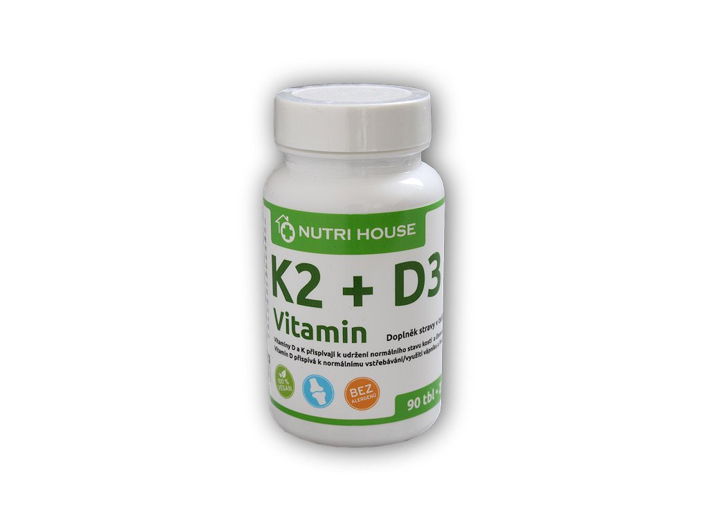 obsahuje: Vitamin K2MK7 (Menachinon), vitamin D3 (Cholecalciferol), pomocné tabletovací látky (mikrokrystalická celulóza, stearan hořečnatý)