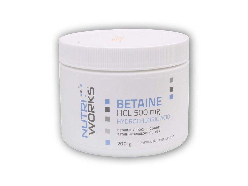 Doplněk stravy. Betain hydrochlorid podporuje přirozenou obnovu kyseliny chlorovodíkové v žaludku. Kyselina chlorovodíková v žaludku podporuje činnost enzymů, které štěpí bílkoviny na aminokyseliny. Je tedy naprosto nezbytná pro zpracování přijaté potravy. Při její snížené hladině přestávají enzymy fungovat a přijaté živiny se nedostatečně zpracovávají. Pokles žaludeční kyseliny může nastat vlivem stresu nebo špatného životního stylu. Hlavní benefity produktu:
