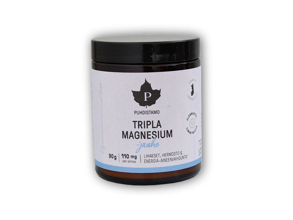 Tripple Magnesium obsahuje tři chelátově vázané formy hořčíku ve formě prášku - malát hořečnatý, bisglycinát hořečnatý a taurát hořečnatý. Hořčík je v těchto formách vázaný s druhou látkou (kyselinou jablečnou, L-glycinem nebo L-taurinem stejným druhem vazby, která se přirozeně vyskytuje v přírodě = chelátová (organická vazba). Díky tomu je pro tělo velmi dobře využitelný, řádově o desítky procent více než u anorganických vazeb (oxidy,…). Hlavním benefitem doplňku Tripple Magnesium je však použití hned tří forem hořčíku. To je zdaleka nejefektivnější cesta z hlediska využitelnosti tělem – zatímco jedné látky se do těla vstřebá určité procento, u tří rozdílných látek se tato hodnota násobí. Kombinace chelátových vazeb + tří forem hořčíku tak dávají dohromady skutečně ultimátní přírodní zdroj hořčíku. Primárním cílem doplňku je samozřejmě doplnění hořčíku. Tento minerál je zřejmě nejdůležitějším prvkem pro sportovce i všechny jedince podstupující zvýšenou zátěž. Jeho vlastnosti souvisí s energetickým metabolismem, nervovou soustavou, funkcí svalů, stavem kostí, psychickou kondicí a mnoha dalšími oblastmi. Použití hned tří forem tohoto minerálu, z nichž všechny jsou chelátově vázané, je obrovským benefitem zejména pro sportující populaci. Sekundární výhodou doplňku jsou vlastnosti látek, s nimiž je hořčík spojen chelátovou vazbu: Malát hořečnatý = hořčík + kyselina jablečná, která se v těle zúčastní tzv. Krebsova cyklu = přeměně živin na energii. V rámci tohoto cyklu se kyselina jablečná přeměňuje na pyruvát, který je zdrojem energie pro svaly = zvýšení výkonu, potlačení únavy + posílení vstřebávání ostatních doplňků stravy. Bisglycinát hořečnatý = hořčík + L-glycin = L-glycin je po L-glutaminu druhou nejvíce zastoupenou aminokyselinou v těle, přičemž se o něm téměř vůbec neví, že je nezbytný pro proteosyntézu a tvorbu kolagenu ve svalech. Spolu s argininem a methioninem se také podílí na přirozené tvorbě kolagenu ve svalech, který je využíván pro obnovu buněčné energie ATP. Jeho další funkcí je, že funguje jako relaxant – zklidňuje nervozitu a napětí, při tréninku však neuspává, naopak pomáhá lépe se soustředit. = posílení tréninkových výsledků, regenerace a soustředění. Taurát hořečnatý = hořčík + L-taurin = L-taurin má vlastnosti související s produkcí oxidu dusnatého (zásobování svalů kyslíkem) a funkcí endotelu - buněk tvořících vnitřní povrch cév a srdce.