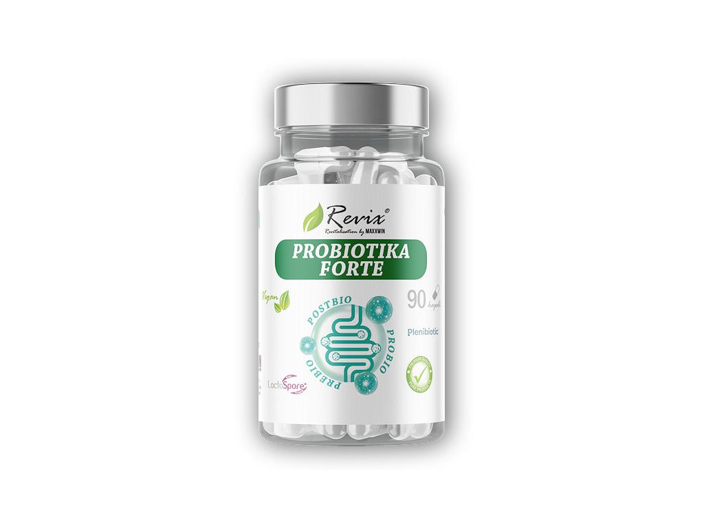 Revix Probiotika Forte obsahují patentovaná probiotika LactoSpore® s vysokou koncentrací (15×10⁹ CFU/g) a inovativní postbiotika Plenibiotic™ (1×10¹² CFU/g). Společně s prebiotiky (inulin, akáciová vláknina) a L-glutaminem vytvářejí optimální prostředí pro růst a aktivitu prospěšných bakterií.